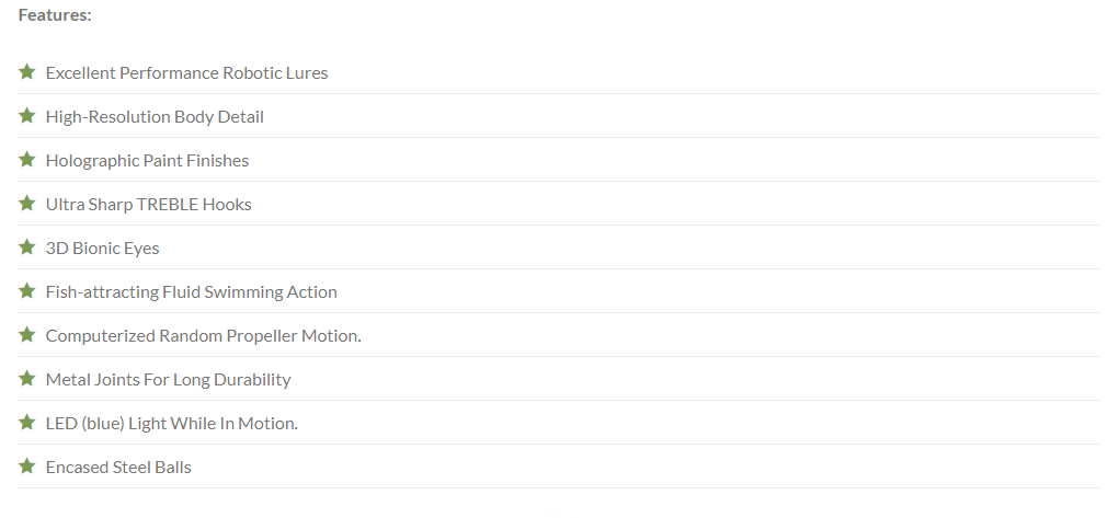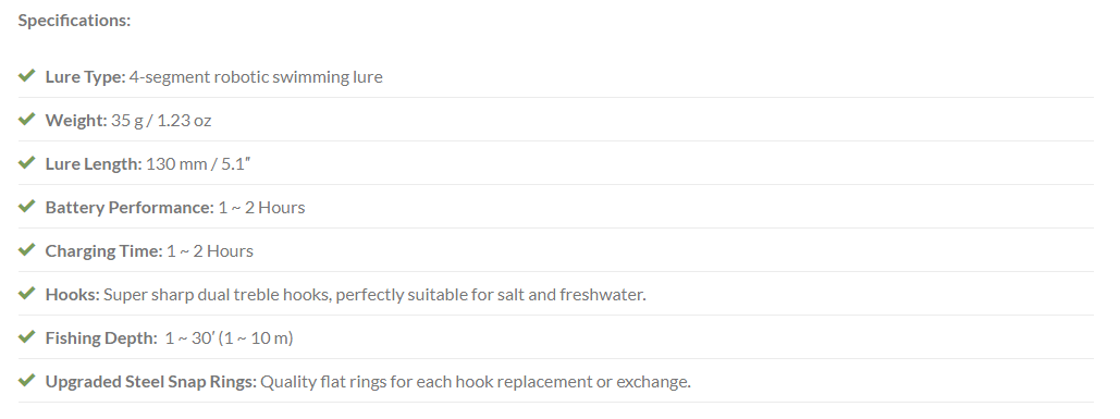 The secret is in the patent-pending front propeller design. It swims, stops, and swims again at random intervals while changing directions, simulating live injured baits with its erratic movements.  This kind of action is invaluable when you cast in a known spot with game fish. Most game fish can’t resist their urges to strike, especially when the robotic lure turns its back and provides multiple opportunities for an ambush.  If you know your games, you know it’s true how much they like to ambush prey. That’s why pro-anglers are going crazy over our Rechargeable USB Swimming Lures.